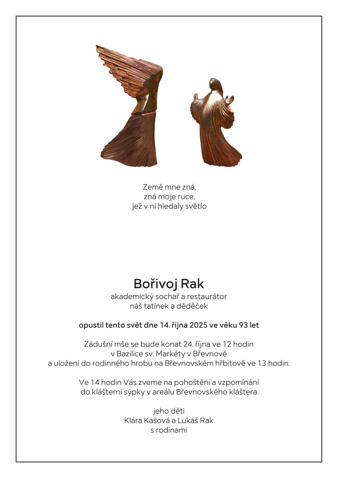 Smutná zpráva - opustil nás Bořivoj Rak, autor naší sochy anděla u kapličky. Čest jeho památce. ![]() ![]() Bořivoj Rak 17. srpna 1932 – 14. října 2025 Narodil se v Praze na Břevnově jako páté dítě do rodiny uměleckého malíře Josefa Raka. Studoval na Vyšší škole bytového průmyslu v Praze a později na Vysoké škole uměleckoprůmyslové v Praze, v sochařském ateliéru profesora Josefa Wagnera. Po absolutoriu v roce 1960 se věnoval sochařské tvorbě, zejména v Plzeňském kraji. Jeho autorská tvorba spojovala cit pro tvar, respekt k materiálu a jistou míru abstrakce. Práce ze šedesátých let zahrnují volné plastiky, reliéfy i spolupráci s architekty na výzdobách veřejných budov. Vytvořil řadu plastik z litého betonu, kamene a kovu, například Tvoření figury, Silné zvíře či kovovou Kalvárii pro náhrobek rodiny Topolových. K volné tvorbě se později vrátil například v návrhu sakrální výzdoby kaple sv. Václava v Mostě nebo v sousoší Zvěstování v Mariánské Týnici – jemně modelované plastice zachycující okamžik setkání Marie s andělem. Dle tohoto návrhu byla také zhotovena socha anděla umístěná u kaple Jména Panny Marie v Kamenných Žehrovicích. Po roce 1968 mu bylo z politických důvodů znemožněno pokračovat v umělecké tvorbě. Na zákaz reagoval slovy: „Zakazujete mi činnost, tak budu opravovat svaté.“ Od té doby se naplno věnoval restaurátorství. Od konce sedmdesátých let žil a pracoval v severozápadních Čechách, kde spolupracoval na záchraně památek poškozených důlní činností. Spolu se svou manželkou, kunsthistoričkou Heide Mannlovou, se podílel na záchraně a obnově mnoha sakrálních památek. Nejvýznamnější část jeho práce se vztahuje k přesunu a restaurování děkanského kostela Nanebevzetí Panny Marie v Mostě, kde vedl restaurátorské práce po jeho přesunu v roce 1975 a pokračoval na obnově interiéru v následujících desetiletích. Podílel se také na restaurování plastik a architektonických prvků především v Klášterci nad Ohří, Duchcově, Oseku a Kadani. Mezi jeho další práce patřily obnovy portálů, epitafů a soch, zejména z období baroka a gotiky. Po sametové revoluci roku 1989 pokračoval v restaurování historických staveb – podílel se na obnově hradu Loket, zámku Jezeří, sousoší na Karlově mostě a dalších objektů. Vytvořil také kopii části tympanonu pražského chrámu Matky Boží před Týnem. Jeho posledním sochařským dílem byla busta stavitele kostela Nanebevzetí Panny Marie v Mostě Jakuba Heilmanna. Závěrečný restaurátorský počin představovala oprava křížku v obci Libětice v Pošumaví, kde trávil poslední léta svého života. Medailon Bořivoje Raka k retrospektivní výstavě v Mariánské Týnici, uspořádané v roce 2012, končí slovy PhDr. Tomáše Pavlíčka: „Dílo Bořivoje Raka odráží složité osudy naší země druhé poloviny dvacátého století. Přesto, nebo možná právě proto, má v sobě určitou mravní naléhavost, odhodlání nerezignovat na lidství, nerezignovat na něco, co nás přesahuje, co nás činí nebo může učinit lepšími.“ Podrobný životopis a vzpomínky: https://www.pametnaroda.cz/cs/rak-borivoj-20190413-0 Osobní fond akademického sochaře a restaurátora Bořivoje Raka, Bc. Hana Kalášková: https://sqzr.cz/acsyu |