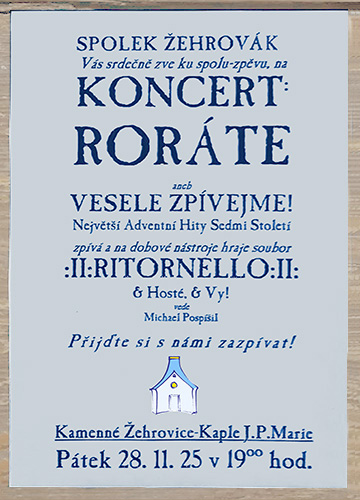 30.11. V pátek v kapličce proběhl koncert RORÁTY, v podání Michaela Pospíšila s doprovodem Beaty Albior, Olgy Kalábové a Ondřeje Dobisíka. Na webu najdete že Roráty jsou prastaré adventní zpěvy, které se zpívají v předvánočním období. Rorátní mše probíhají v brzkých ranních hodinách, typicky jen za svitu svící a to vyvolává jedinečnou atmosféru. Náš koncert se sice uskutečnil v podvečer, ale díky špičkové interpretaci a řadě zajímavých informací se bezesporu dostavila i ona atmosféra.